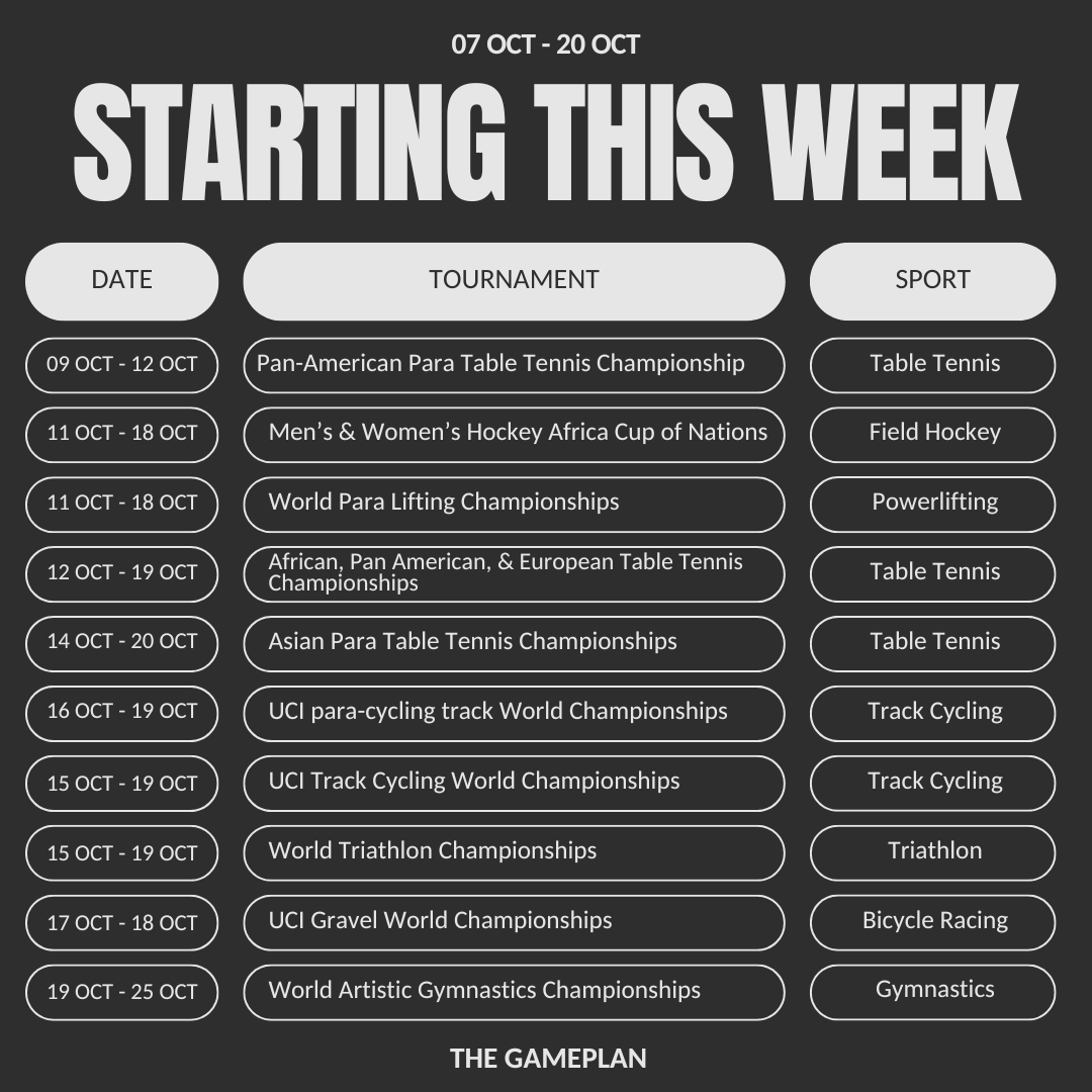 I SWEAR I’m not being lazy, but even over 2 weeks we have a very small number of sporting events this week. Even in the second graphic, Cycling and Table Tennis somehow make up for more than half of the events: